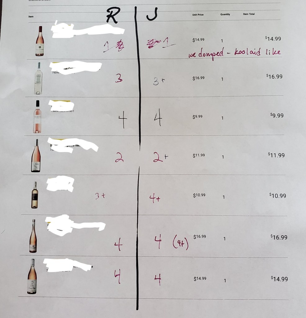 Normally I go to at least one big rosé tasting hosted by a favorite local shop, and that’s where the seeds of our rosé collection for the year get planted. Between no tastings and no chance to wander the aisles and shelves of all of our favorite places, we had to resort to curbside pickup at one of the large chain shops. (We were still buying smaller amounts of “the good stuff” and getting our wine club selections, but we also needed some cheap-and-cheerful pink to get us through) I would scroll through the website and look for the key things we enjoy – Southern French (Rhône and Provence) for me, and Oregon Pinot Noir for Roman. We wanted to stay well south of $20 per bottle, but also did not want to dwell too close to $9.99 (I’ll write more about how we came to our PWPP [personal wine price point] later). We picked up 12 options to start, and set up a 1 – 5 rating system (5 being best). It worked well for us, even if we tried to be too kind to one truly awful wine that we had to dump, and we were able to agree on enough 3 and up wines that were affordable to keep us going.