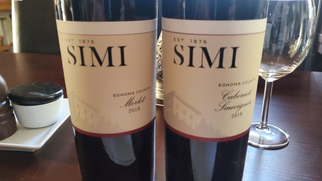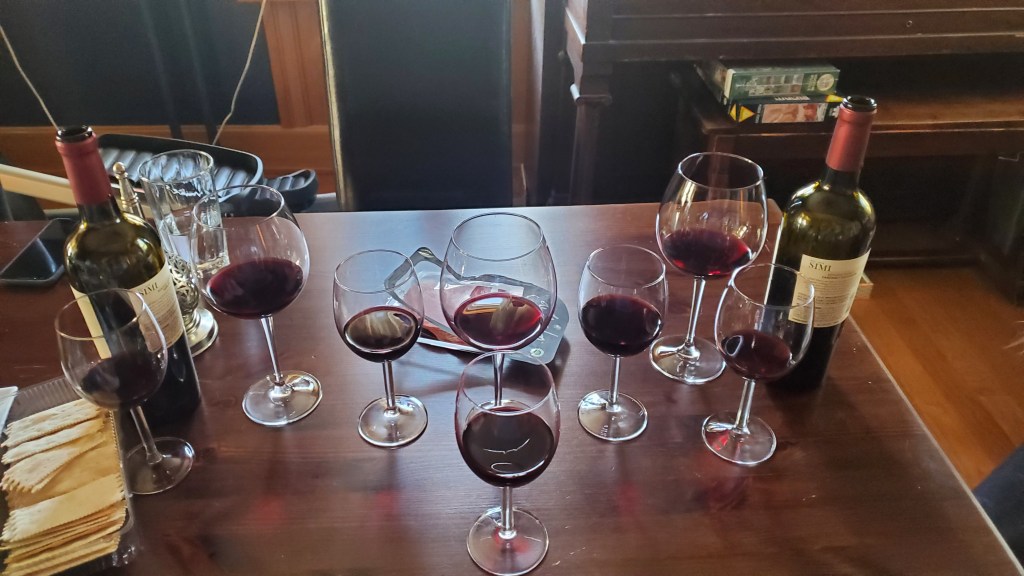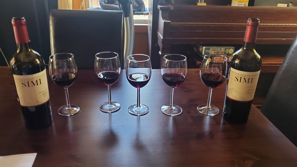 As time passed, we started noticing how the flavors developed, particularly for the CabSauv, after some time and air. Big glasses to the rescue! We pulled them out particularly to more deeply compare the 100% and 50/50 glasses. We also got out some snacks as that seemed the right thing to do as well. The Merlot became even more plush with air, and the salt and fat of our charcuterie made the berry notes sing. It even tempered the tannins of the CabSauv nicely and brought forth its black pepper notes. For R, the oak became more noticeable with the bigger glasses. These flavors also made me think of the additional grapes used in red blends that would help balance these two — I was thinking Cabernet Franc or Petit Verdot (again, I clearly think like this winemaker as they are both in small amounts in the CabSauv already). Simi does offer a 100% Petite Sirah, so that might be a fun 3rd note to try. . . Oh, and even the CabSauv dominant glass improved with air, holding on to the structure and taming the fire a bit.