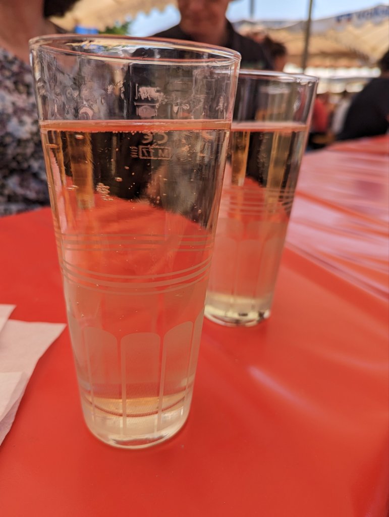 We found a shady spot in the Fest seating and enjoyed our Wursts. It was very like we had never left. There were tons of drink options, including the expected beer and the less expected tequila bar hosted by “Grannies.” We scoped out the wine options, each starting with a 0.2l of Riesling Trocken. The heat and the excitement made those glasses go down all too quickly, so we made the choice to switch to Schorles to make sure we were hydrating as we went. Weißherbst was my gateway into loving rosé, and the ones being served at this fest were classic–delicate red fruit whispering in the background and acidity and minerals taking the lead.