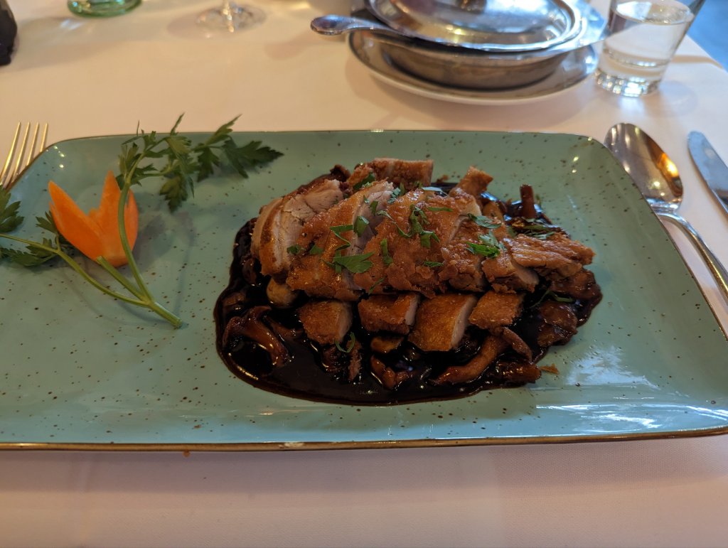 That evening we wanted to go to R’s favorite Chinese restaurant, but we discovered they were closed for Urlaub. Luckily we found another one with a similar vibe and great looking menu. They also had a pretty great wine list. Being in Europe means that buying bottles of wine with dinner is not that expensive, and having so many local options was practically dizzying. You can find some Allendorf offerings in the US, particularly their “Save Water Drink Riesling,” but they don’t export a lot of their GG Hasensprung. Having a 6 year old bottle of very good Riesling is a bit of an adventure. Riesling has what is often referred to as a double bell in aging –it’s very good on release and then for a while, then drops off a cliff for a while, not bad, but not great, then the wine gets a second wind and can be amazing after another chunk of time. This one had not fallen off that cliff yet, and it was the perfect dry Riesling with our dinner.